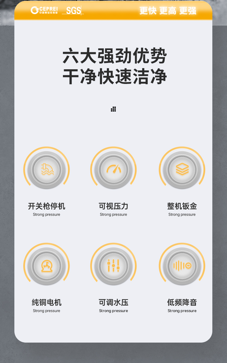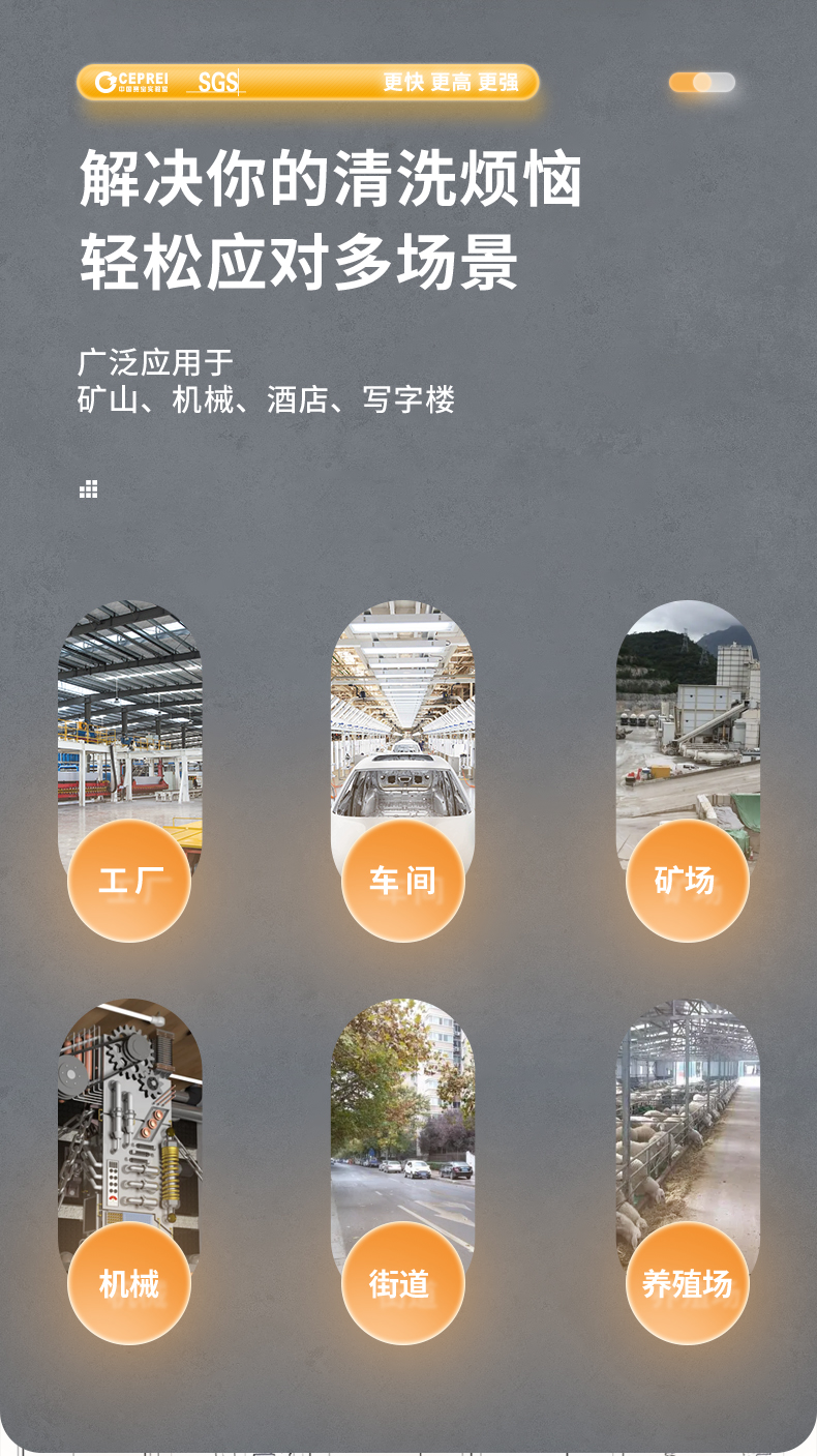 橙犀高壓清洗機 YG1015:高壓沖洗,強效去污看的見,廣泛應(yīng)用于各個場所,高成本鈑金工藝,抗老化不生銹材質(zhì),不受限制,清潔更流暢。