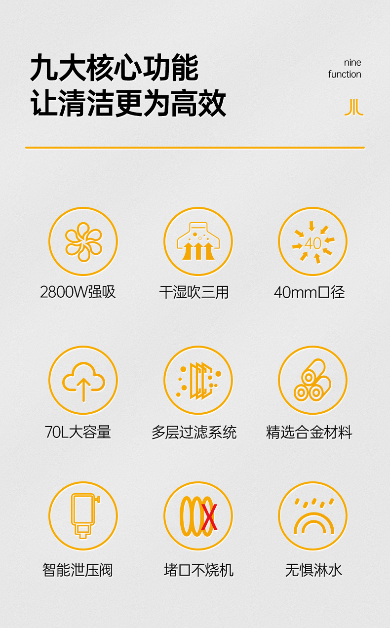 橙犀吸塵器 CRS-2870:強大吸力無懼打顆粒污物,2800w強吸,干濕吹三用,40mm口徑更大吸力,大搭配多款刷頭,無懼臟污,擁有渦輪大功率電機。